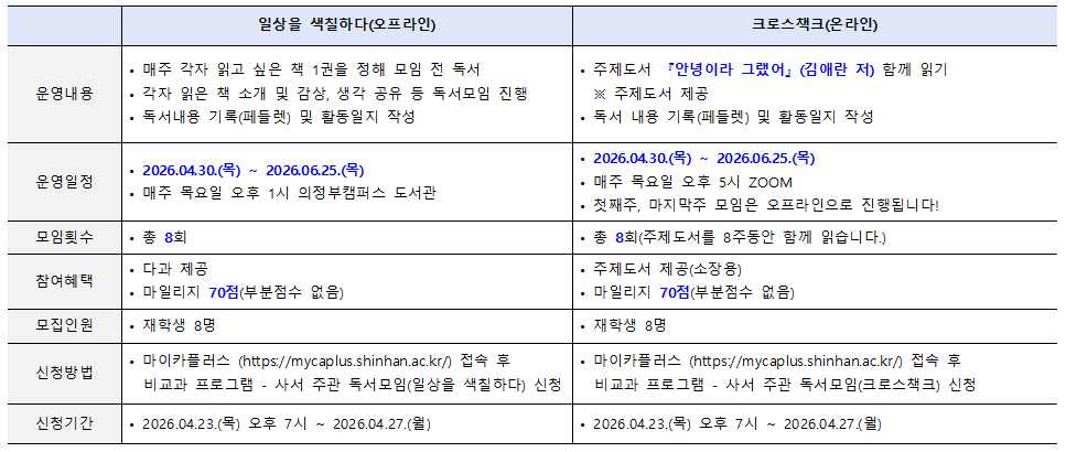 [중앙도서관] 2026학년도 1학기 재학생 독서 동아리 모집 안내최웅이 2026-04-21 17:04:44.263